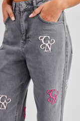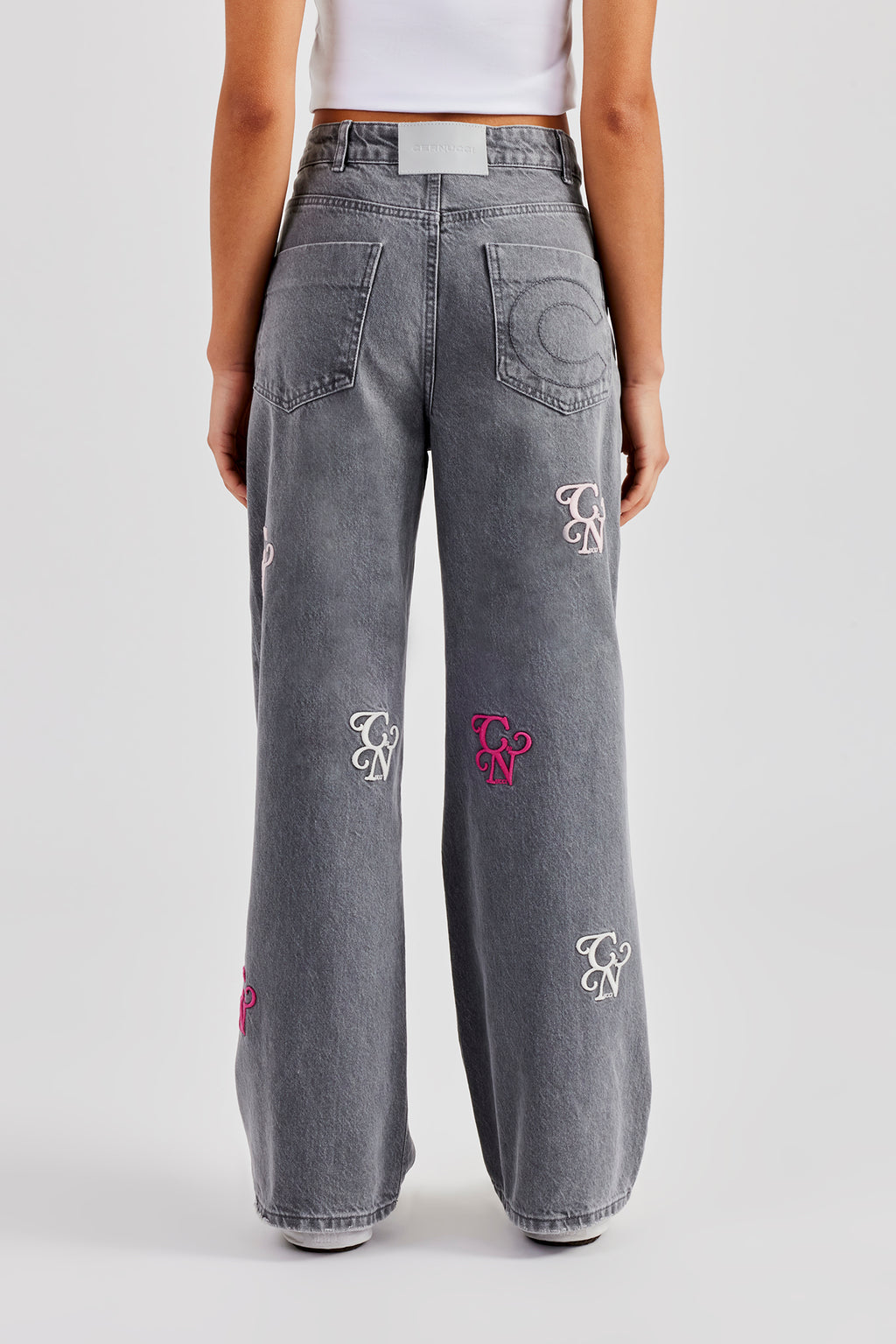 Washed grey branded jeans, in rigid cotton denim. Baggy fit with embroidery, finished with branded trims.
