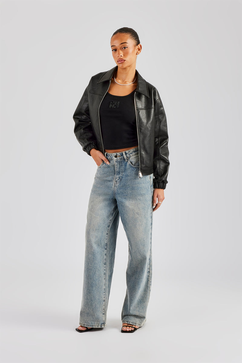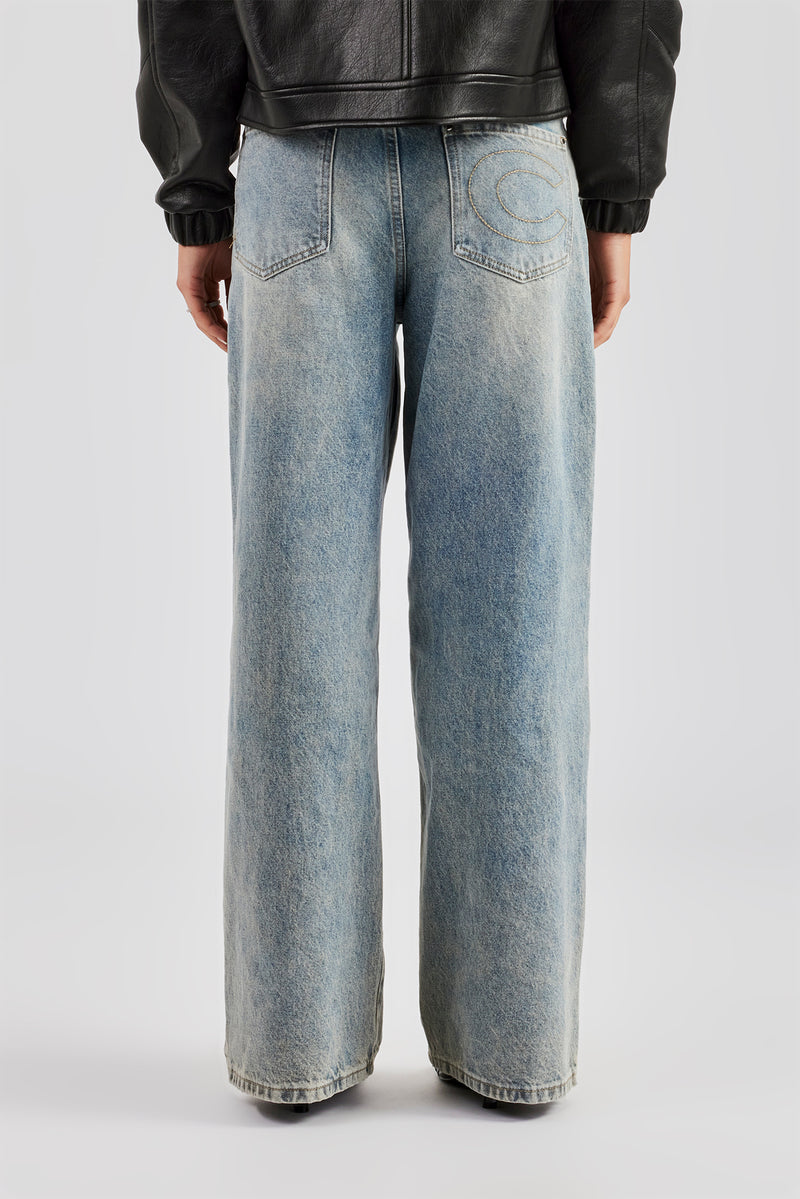 Antique wash jeans, in rigid cotton denim. Baggy fit finished with branded trims.