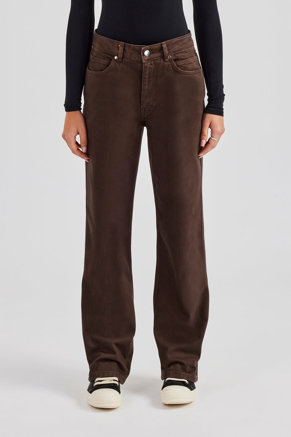 Our new dark chocolate jean, in rigid cotton denim finished with back pocket embossed detail.