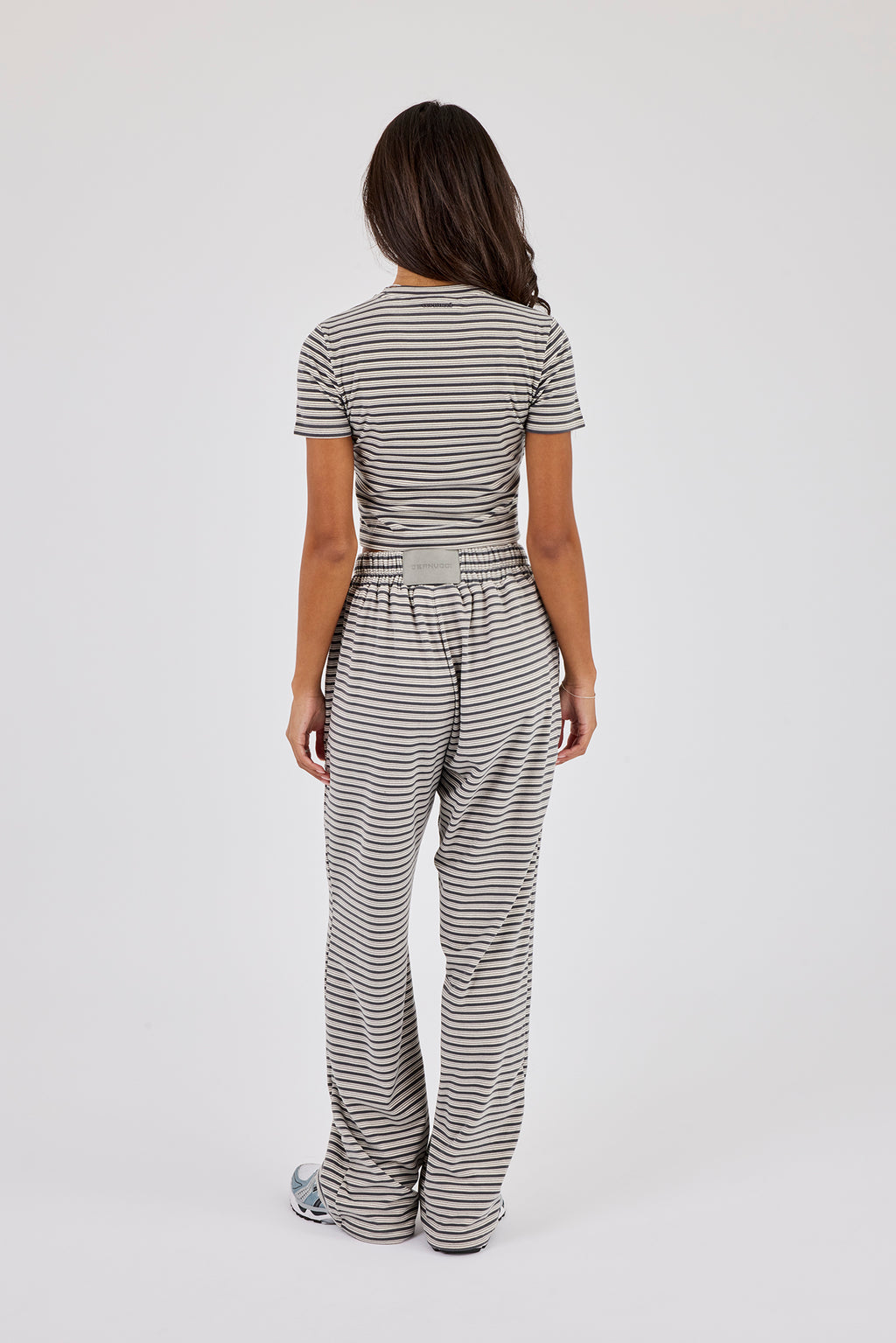 Soft Touch Double Stripe Short Sleeve Top & Button Detail Wide Leg Jogger - Grey