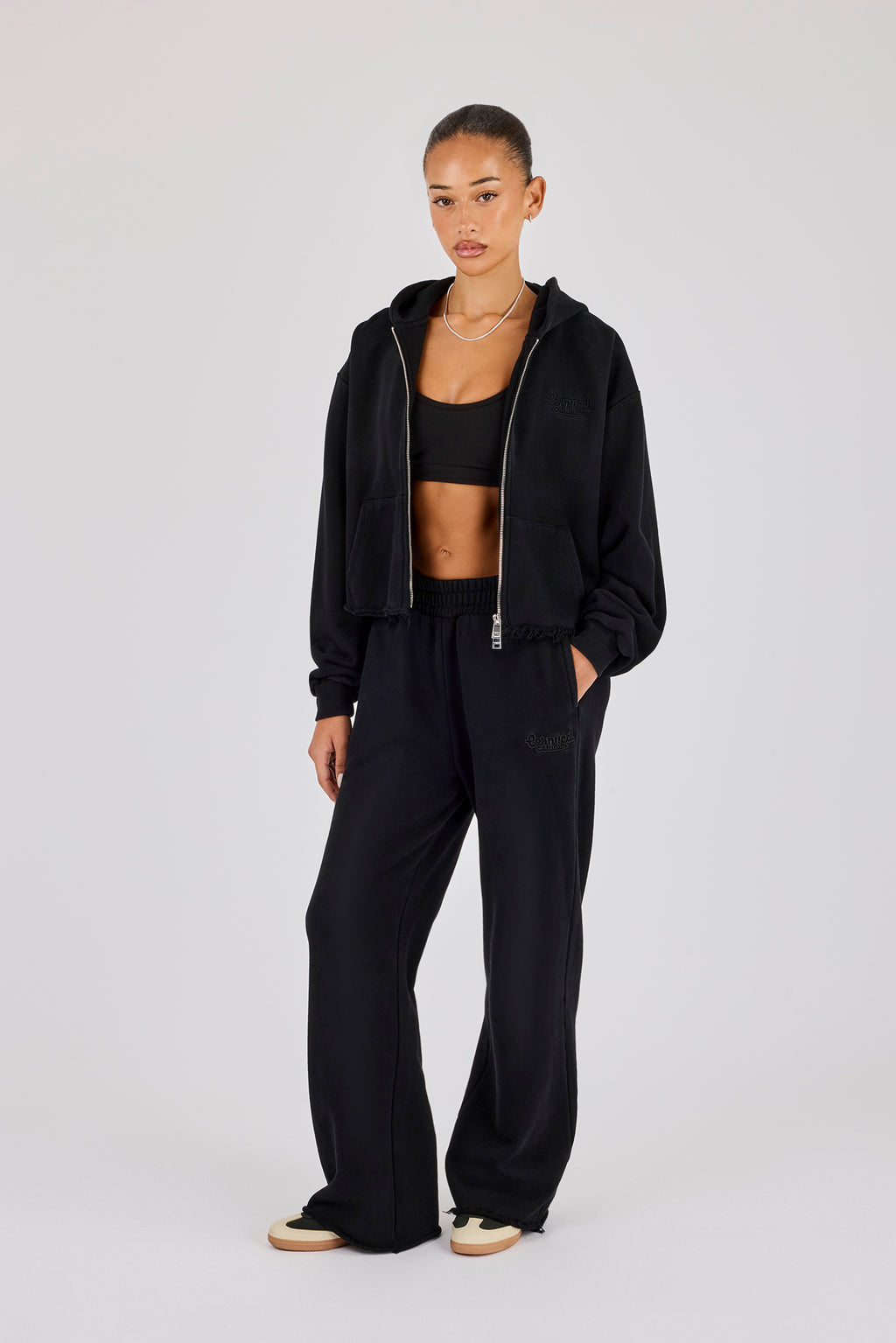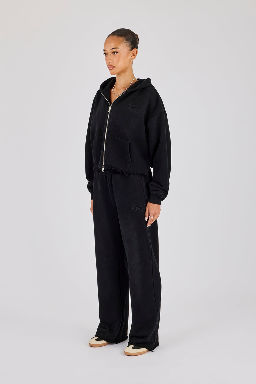 Womens Washed Boxy Fit Zip Through Hoodie & Wide Leg Jogger - Black